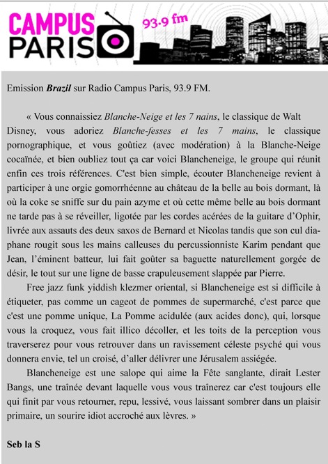 Né de la rencontre, en septembre 2004, de six parisiens d’origines et de sensibilités diverses, le groupe blancheneige réunit des musiciens inspirés par le jazz et les musiques orientales, mais ayant évolué aux sons des musiques actuelles. blancheneige est une alchimie de styles, arrangés façon musique improvisée ponctuée de thèmes et de rythmes envoûtants. Leurs seuls mots d’ordre : recherche, voyage et fête !
